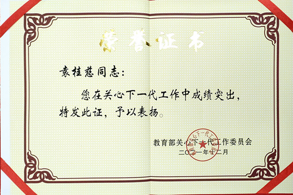 会议对全国教育系统关心下一代工作先进集体、先进工作者和突出贡献者进行了表彰。兰州理工大学关工委“五老”袁桂慈教授被评为全国教育系统关心下一代工作先进工作者。据悉,全省共有10位“五老”获得该光荣称号,1位“五老”被评为全国教育系统关心下一代工作突出贡献者,4家单位的关工委被评为全国教育系统关心下一代工作先进集体。
