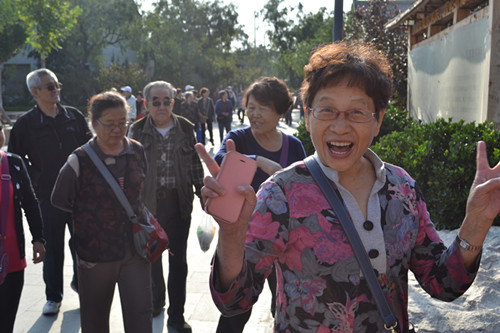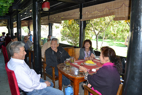 到达景区后,老同志们开始自由活动,他们有的置身七号大院,临窗而坐,静心养气,品茶畅聊;有的漫步园内,观翠竹荷塘,赏鸟语花香,怀着喜悦的心情笑看那红灿灿的山楂和鲜枣挂满枝头,压弯了树丫;有的远离城市喧嚣,陶醉于山林静谧;有的登临仁寿山顶,鸟瞰山下十里桃海、青砖宅院,感受近年来金城兰州日新月异的变化。