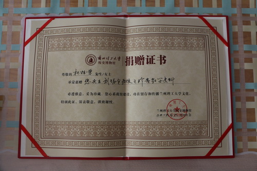 6月13日下午,在杜桂荣老师家中,杜老师将她个人和她丈夫(原化工学院院长刘振全教授已故)的教学资料等捐赠给学校校史博物馆。这对于丰富学校校史资料、开展校史研究都将具有重要的价值。党委宣传部段开军部长对杜桂荣老师为校史博物馆捐赠珍贵史料表示感谢,在她家中向杜桂荣老师颁发了《捐赠证书》。